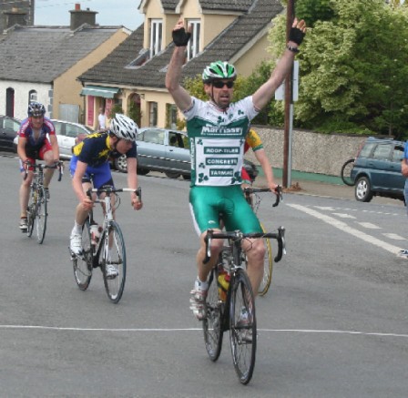 Congratulations to Martin O’Loughlin on yet another fine win in the B/C/Jun/Vet Kevin McInerney Memorial in Dunlavin Co. Wicklow on Sunday last. Martin was in the thick of things all day along with teammate Diarmuid Carew. In the end Martin tried to lead out Diarmuid for a well deserved win, but with the fast finishing Aaron Bugle closing fast, had to go for it himself to ensure yet another Dan Morrissey victory. A great result with Martin in first and Diarmuid in third. Some pictures in the gallery (Courtesy of Gary McIlroy) http://www.carrickwheelers.com/PhotoGallery/categories.php?cat_id=20