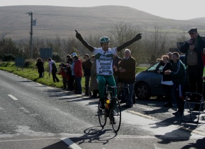 Martin O’Loughlin retained the Lacey Cup in Tralee on Sunday last in fine style. The organisers, wary of Martins win last year decided to place the veterans under 45 with the B group instead of the C group. The result was a fine afternoons racing with the B group catching the C group shortly after the village of camp. Martin, assisted ably by newly minted super-veteran colleague Rory Wyley, controlled the race well and eventually got into a break shortly after the halfway point with Keith Gater of Comeragh CC and Tom Shanahan of Limerick CC. On the final climb Martin was able to give both of them the slip to ride in on his own 15 seconds ahead.